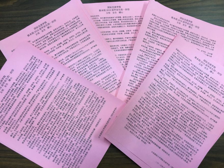 学院还为毕业生特制了《国际交流学院致本院2016届毕业生的一封信》,主题是“文明、安全、暖心”,旨在提倡毕业生在校的最后一段日子,加强自身诚信修养,待人真诚,珍惜在校时光,能够采取健康文明的方式告别母校,加强自身防范意识和安全意识,通过这种信件的形式使毕业生感受到学校和学院的温暖。
